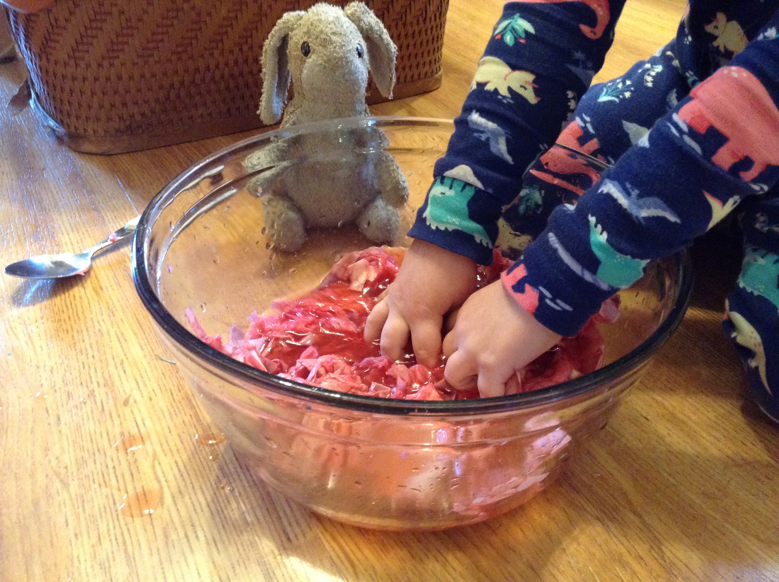 2020 Update: My kids are now 5 and 3 and this is still a fun family activity. I just have to embrace that my kitchen floor will get very wet during the creation process :)! Most of our family now gives us Christmas presents in reusable wrapping (Yay family!!!). So now we save the bright colored papers that get sent home from school. This also allows us to make hearts of different colors!