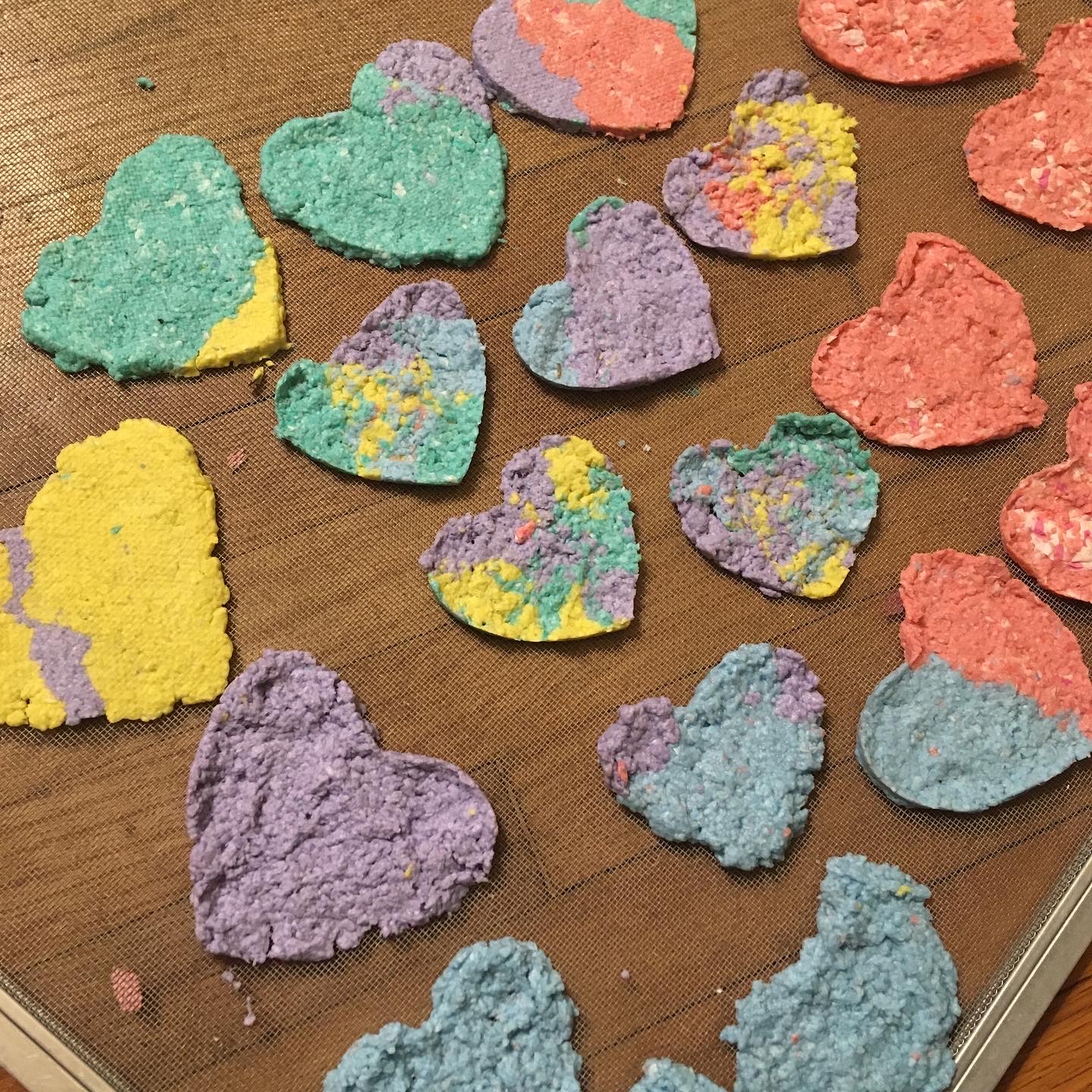 4. Pick up the pulp one handful/spoonful at a time and squeeze out a little of the water. Shape the pulp into heart shapes, about 1/4 inch thick. Use a spoon to smooth out the pulp. We had a heart shaped cookie cutter to use as a guide, but you could also draw hearts on a paper and have your kids put the pulp inside the lines. As a side note, you could also do different shapes to make birthday or Christmas cards!