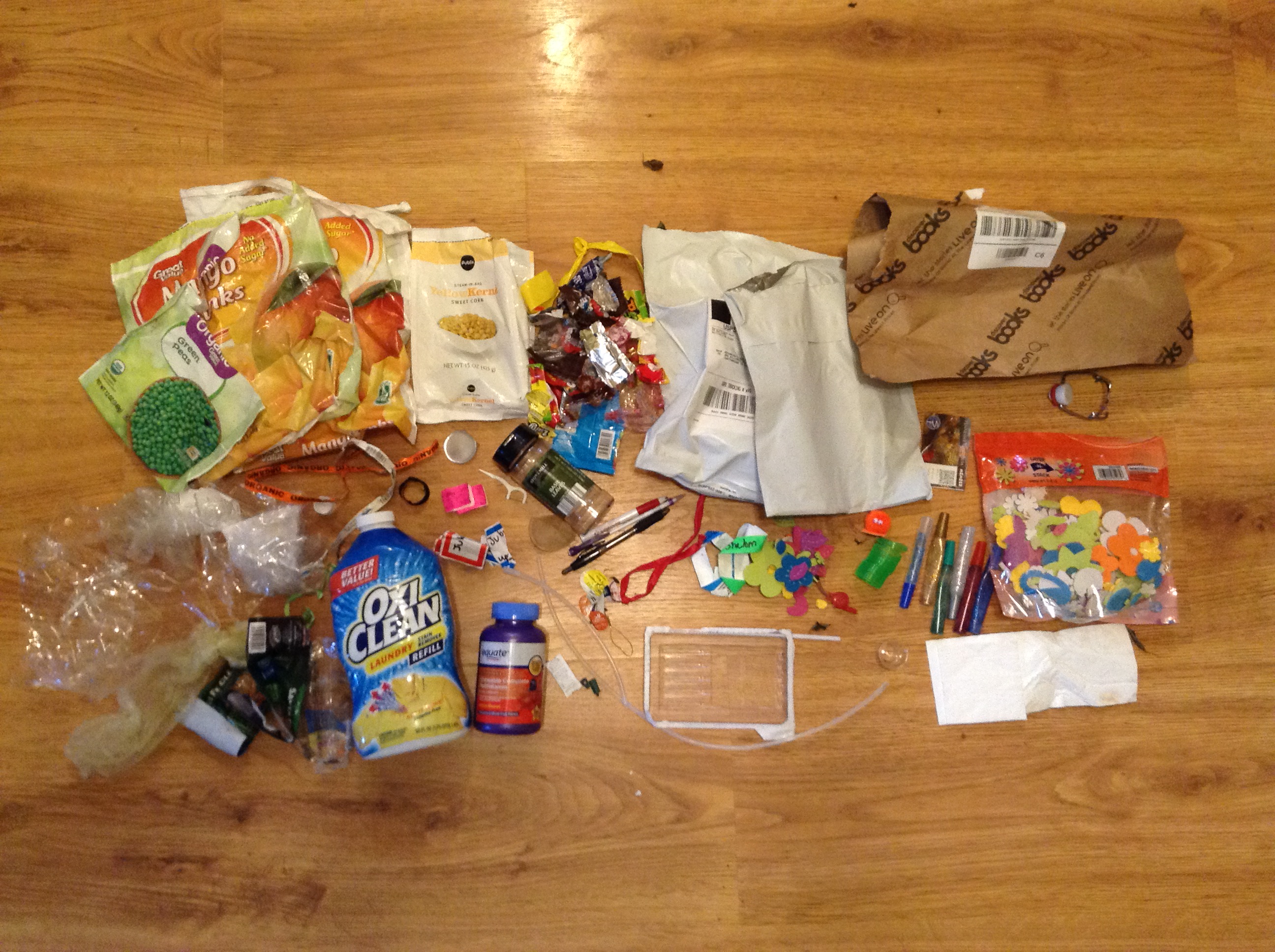 Our waste was much more than last month! This is mostly because after writing my reflection on a year of zero-waste, I realized that there were items that had been sitting in my freezer for a whole year! We have been enjoying fresh produce all summer and fall, but now it is time to use up all those frozen veggies and fruit! I also had a lot of kids art supplies that are totally terrible for the environment, see the glitter glue pens and foam stickers! But, I bought those before I knew, so we might as well use them up. The oxiclean, multivitamins, and spice container are also from our pre-zero-waste days. To see a post on how I detoxed our cleaning supplies, read here.